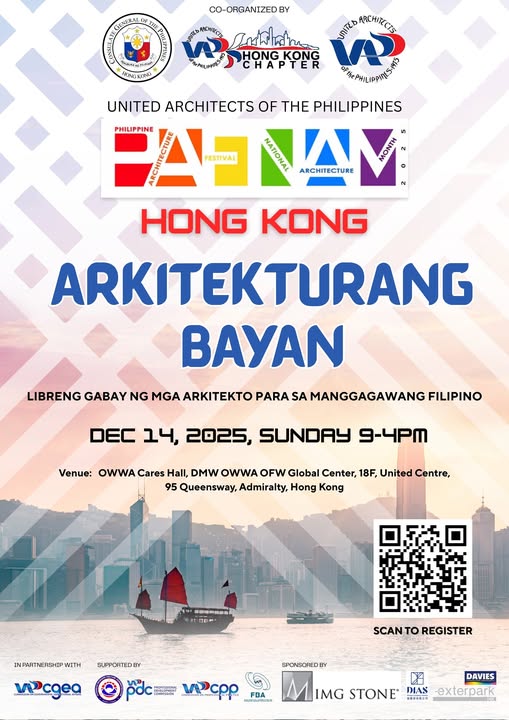 In celebration of the Philippine Architecture Festival and National Architecture Month (PAFNAM), the ๐ฃ๐ต๐ถ๐น๐ถ๐ฝ๐ฝ๐ถ๐ป๐ฒ ๐๐ผ๐ป๐๐๐น๐ฎ๐๐ฒ ๐๐ฒ๐ป๐ฒ๐ฟ๐ฎ๐น, in partnership with the ๐จ๐ป๐ถ๐๐ฒ๐ฑ ๐๐ฟ๐ฐ๐ต๐ถ๐๐ฒ๐ฐ๐๐ ๐ผ๐ณ ๐๐ต๐ฒ ๐ฃ๐ต๐ถ๐น๐ถ๐ฝ๐ฝ๐ถ๐ป๐ฒ๐ ๐๐ผ๐ป๐ด ๐๐ผ๐ป๐ด ๐๐ต๐ฎ๐ฝ๐๐ฒ๐ฟ, invites our ๐พ๐๐๐๐๐๐ฆ๐๐๐ in Hong Kong to โ๐๐๐๐๐๐๐๐๐๐๐๐๐ ๐๐๐๐๐โ, a free architectural consultation and guidance program designed to assist Overseas Filipino Workers in planning, building, or renovating their homes in the Philippines.