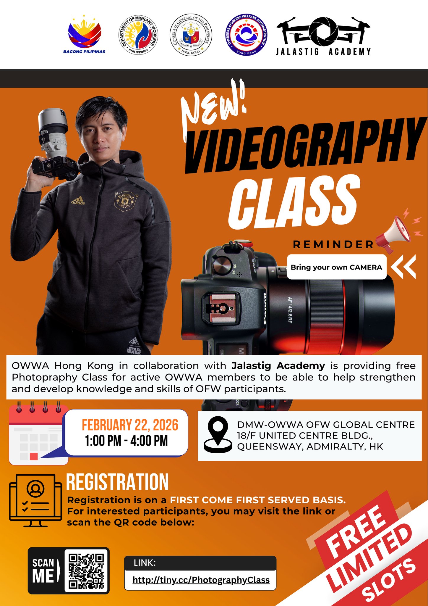 OWWA Hong Kong, in collaboration with Jalastig Academy, is offering a FREE Videography Class to help strengthen and develop the skills of OFW participants.