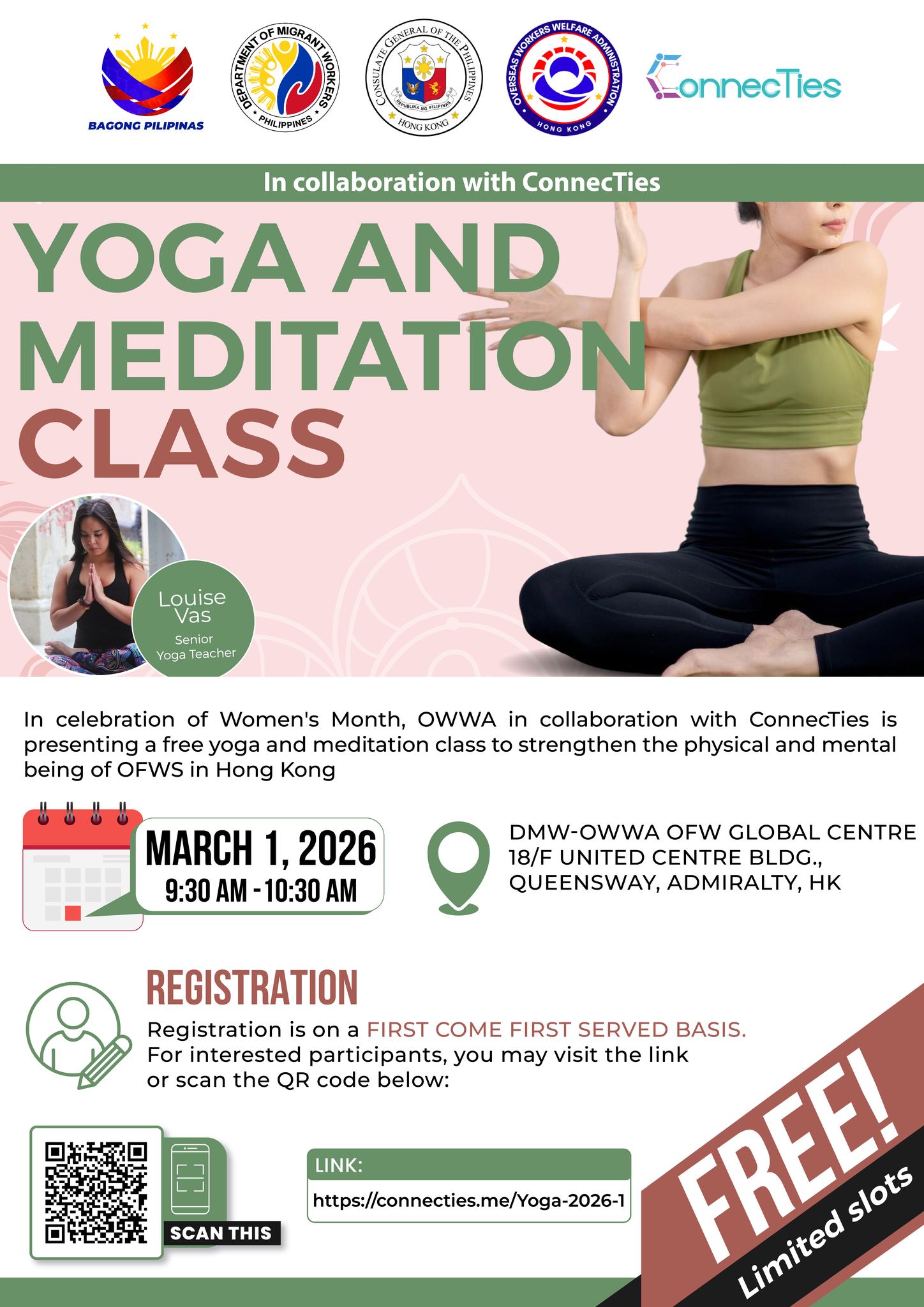In celebration of Women’s Month, OWWA Hong Kong, in collaboration with ConnecTies, is offering a FREE Yoga and Meditation Class for OFWs in Hong Kong.
