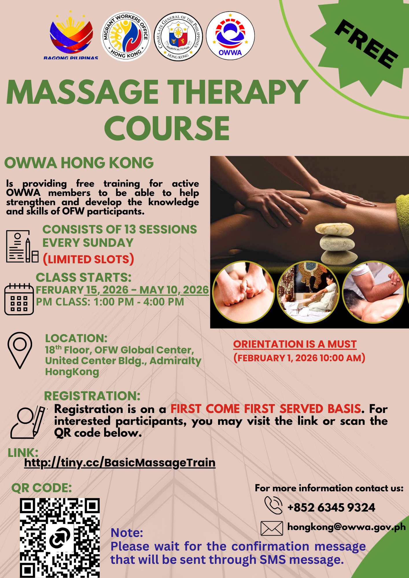 Calling all active OWWA members! Enhance your skills with our FREE 13-session Massage Therapy Training happening every Sunday from February 15 – May 10, 2026 (1:00 PM – 4:00 PM) at the OFW Global Center, Admiralty, Hong Kong.