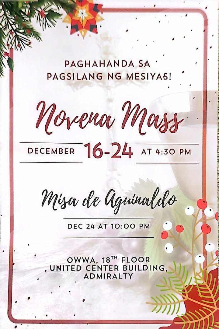 We invite you to Join us for 𝐌𝐢𝐬𝐚 𝐝𝐞 𝐀𝐠𝐮𝐢𝐧𝐥𝐝𝐨 𝐨𝐧 𝐃𝐞𝐜𝐞𝐦𝐛𝐞𝐫 𝟐𝟒 (𝟏𝟎 𝐏𝐌) at 𝐃𝐌𝐖-𝐎𝐖𝐖𝐀 𝐎𝐅𝐖 𝐆𝐋𝐎𝐁𝐀𝐋 𝐂𝐄𝐍𝐓𝐄𝐑 . It is a time to gather and give thanks. We look forward to your presence as we celebrate together. 🎄🎄