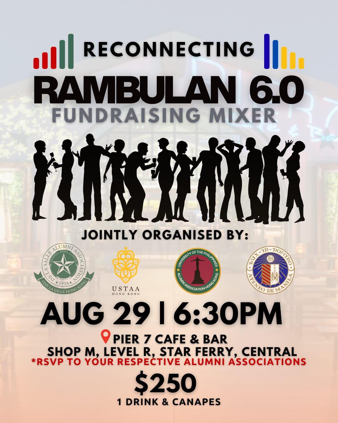 It's been a while since we all got together with our friends who are alumni from UAAP-member schools. So please join us for "Reconnecting: Rambulan 6.0 Fundraising Mixer" in support of raising funds for one of the most anticipated friendly competitions in fun games and camaraderie among long-time Filipino residents and expats in Hong Kong.